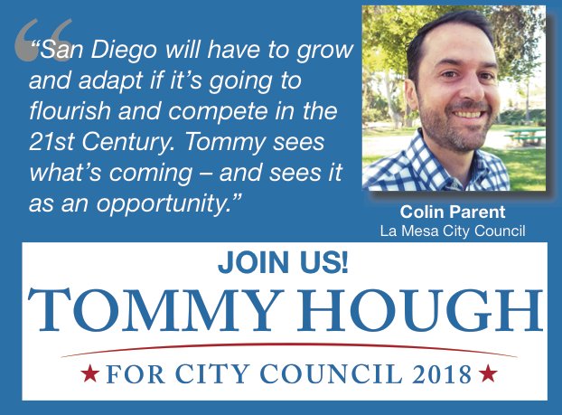 @LMFDems about my#D6 campaign for San Diego City Council, I'm grateful to announce the endorsement of@CirculateSD executive director and#LaMesa city councilmember@ColinParent. Thank you!#VoteTommy2018#FlipD6pic.twitter.com/sutT2MyADw
