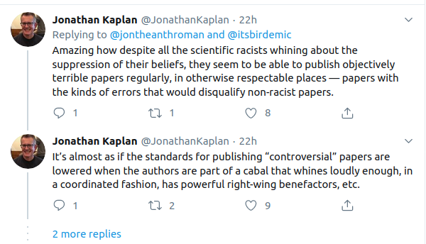Top anti-racist philosopher, of science no less, claims that: If one can publish papers "regularly" in favor of X, then there is no suppression against work in favor of X. I think given a few moments reflection most people can probably figure out this conditional is not true.pic.twitter.com/Gw25G5vCXM