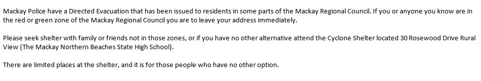 Can we trouble you to share this message again please folks? Important evacuation centre information for Mackay residents.
