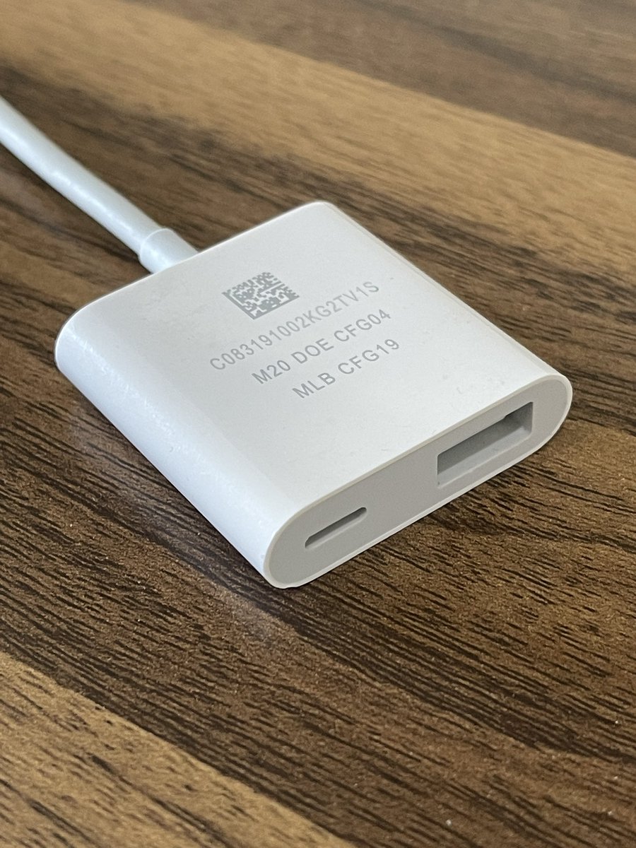 A #prototype Apple USB Camera Adapter. Has an engraved serial, config information, and data matrix on the front. Also has engravings on the lighting connector. #appleinternal #applepic.twitter.com/SXeSgnWtrv