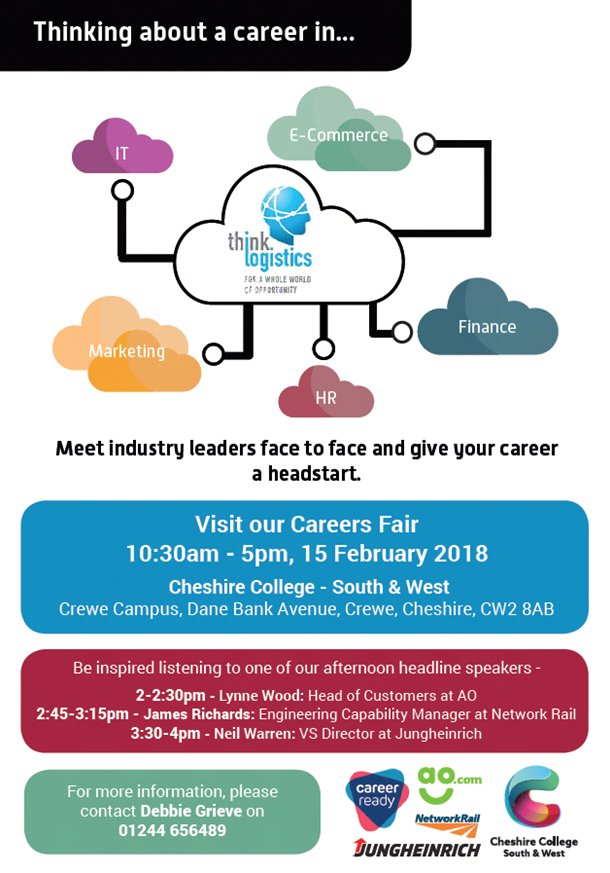 #Logistics?@ThinkLogistics1 are holding a Careers Fair@CheshireCollSW on Thursday, February 15th in#Crewe#Cheshire Come and meet......@CareerReadyUK@ao_jobs@networkrailJOBS@JungheinrichUK#JobsThatMovepic.twitter.com/bX1piJJk4N