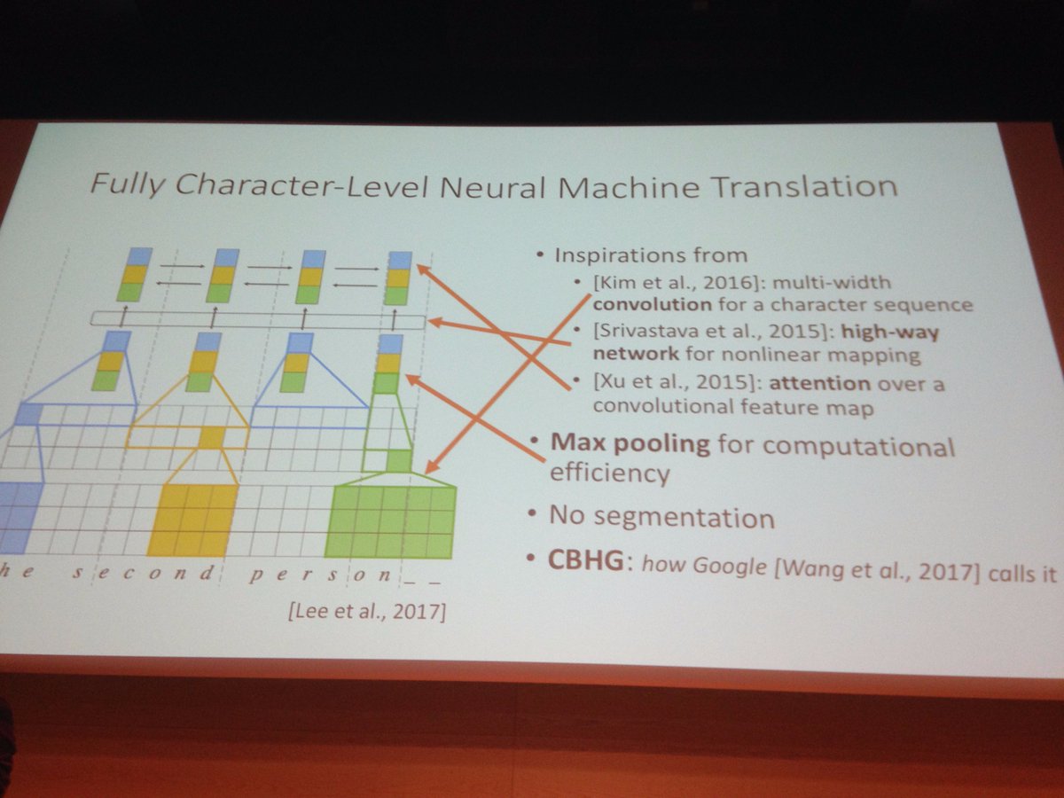 @kchonyc on going down to character (bytes ?) level in NMT at#emnlp2017. Philosophical questions inside !pic.twitter.com/sbSptxhNCT