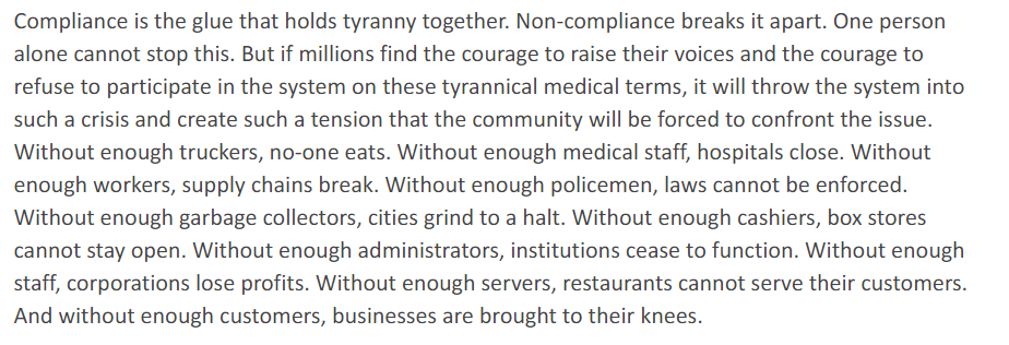 The solution is already in play. The French aren't frequenting bars and restaurants that insist on vax passports. Hospitals are closing in America due to staff shortages. Many businesses are struggling due to staff shortages. Eventually, non-compliance will be the ONLY way out.pic.twitter.com/NlTl8WI5zR