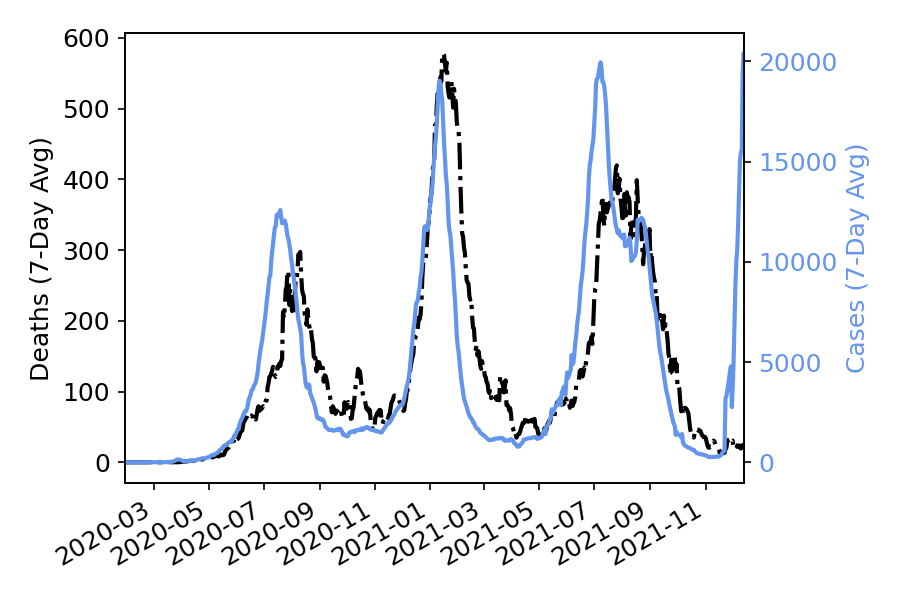 Took a look at the omicron data out of stress/curiosity (reposting with more data, disclaimer: I am NOT an epidemiologist). Cases are way up in South Africa, deaths are not. Since deaths lag cases, not clear to eye whether low deaths are unusual or just not here yet. (1/3)pic.twitter.com/gyQgS4Bblz
