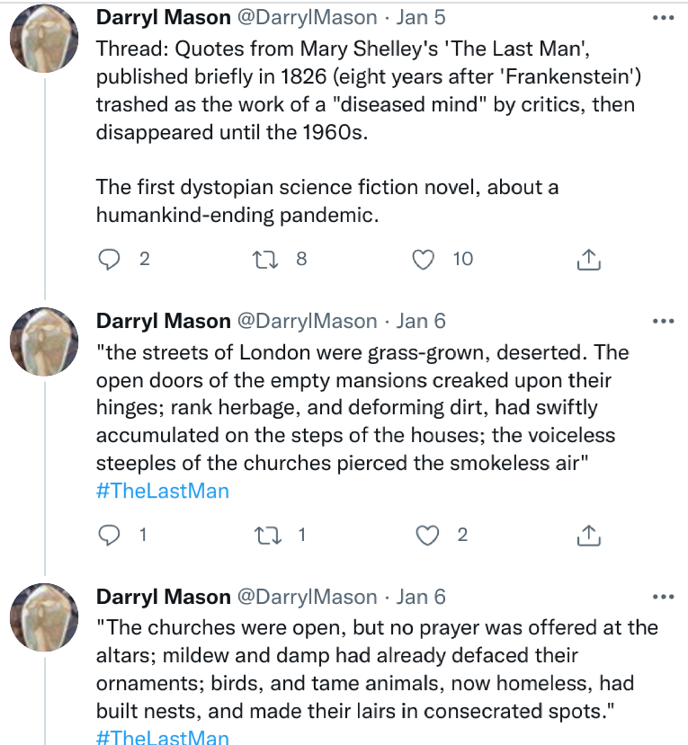 A little background and some quotes from Mary Shelley's 1826 dystopian novel 'The Last Man.' She wrote this novel in an incomprehensible grief, after the death of two of her children and her husband