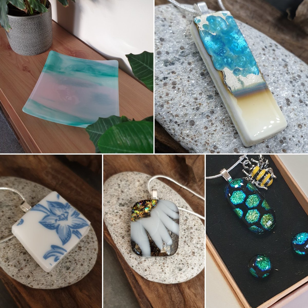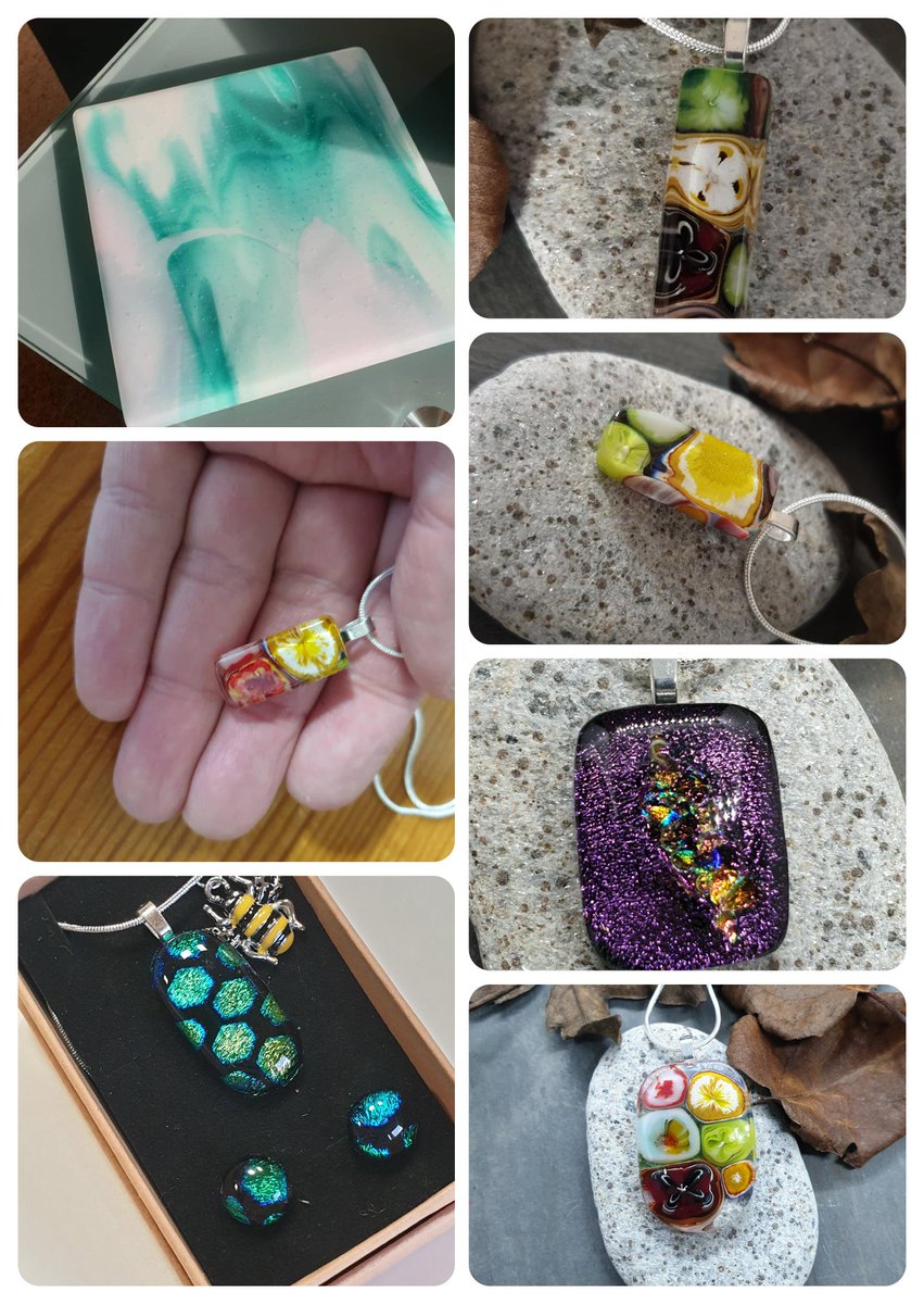 Some of the new pieces I completed earlier. Lovely swirled glass platter, floral glass pendants and bee inspired jewellery set.