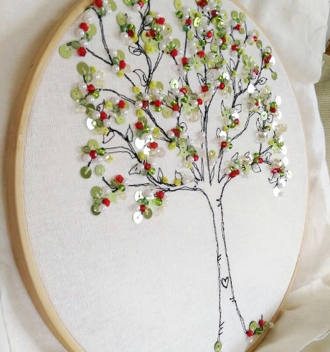Have you got your pre-stitched tree yet? How will you decorate it? I added tiny leaves to this one and covered it in tiny beads of green and red (plus a few sparkly sequins!) all ready for framing.