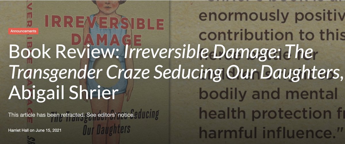 I was really shocked to see a piece published on @ScienceBasedMed last week where the claims from an anti-trans book were repeated uncritically and without evidence. The piece is now retracted, for which I am relieved. (Though it was immediately given a platform elsewhere.)pic.twitter.com/kLcbU6Ic1E