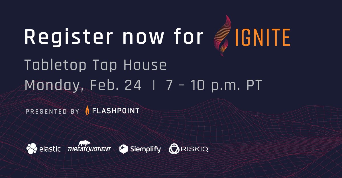 #RSAC 2020? Look no further! RSVP now to come celebrate with Flashpoint,@elastic,@ThreatQuotient,@Siemplify, and@RiskIQ at IGNITE! https://okt.to/Pj6VtW pic.twitter.com/9GWiXRHFzt
