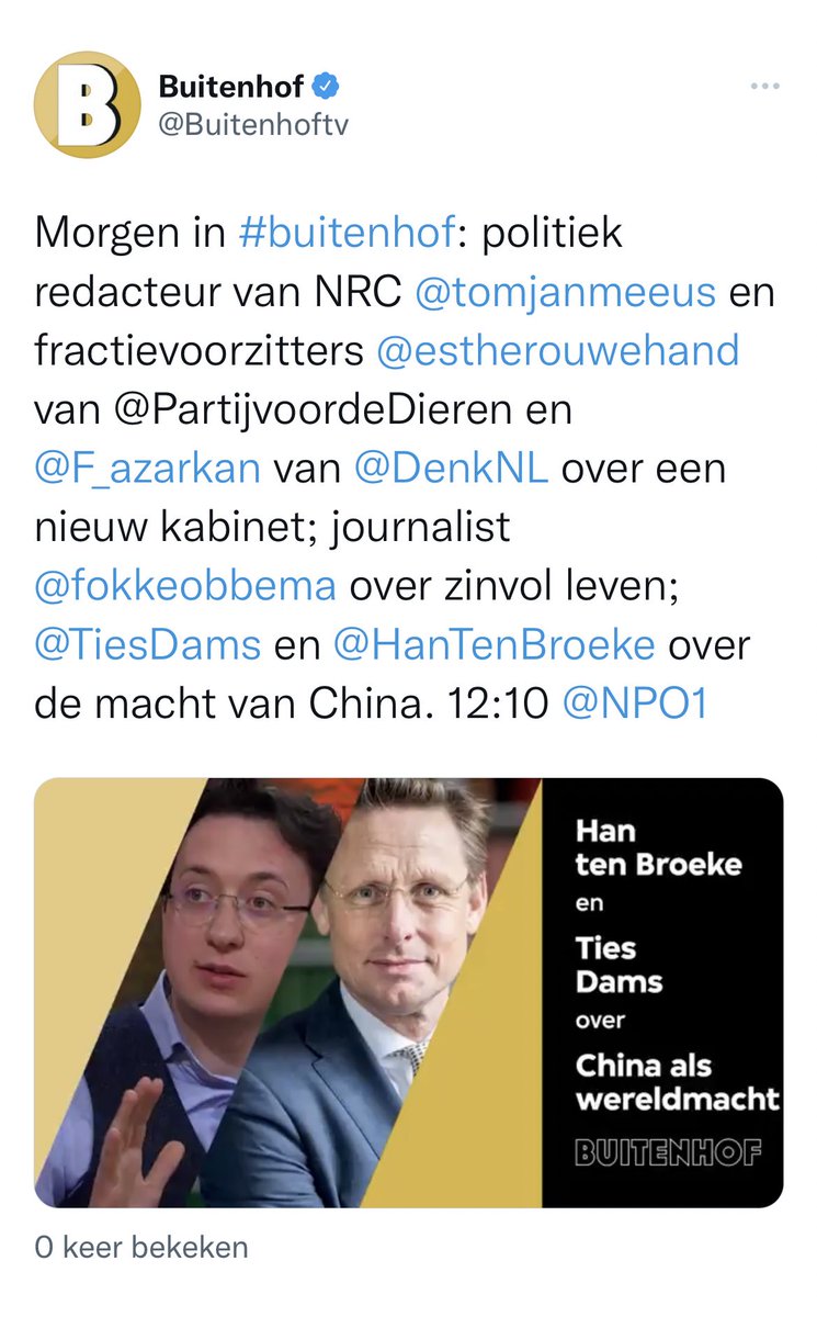 #buitenhof@F_azarkan van@DenkNL@estherouwehand van@PartijvdDieren en@tomjanmeeus van@NRC over de ontwikkelingen in de formatie.@TiesDams en@HanTenBroeke over hoeveel zorgen het Westen zich moet maken om China. En@fokkeobbema over een zinvol leven. 12:10@NPO1pic.twitter.com/pfhEQwyQAzBedankt, Twitter gebruikt dit om je tijdlijn te verbeteren. Ongedaan makenOngedaan maken -