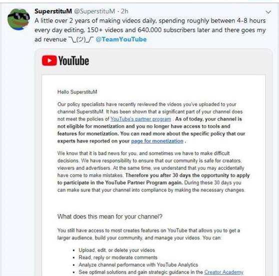 @TeamYouTube I'm begging TeamYouTube please solve my problem. I just got demonetized . I have zero copyright strikes and no any reused content, and all my channel content made by myself without use any other creator content My channel link https://www.youtube.com/channel/UCoroDMhT5gCCDR9OuV7zAQw …pic.twitter.com/ritzFAuecf