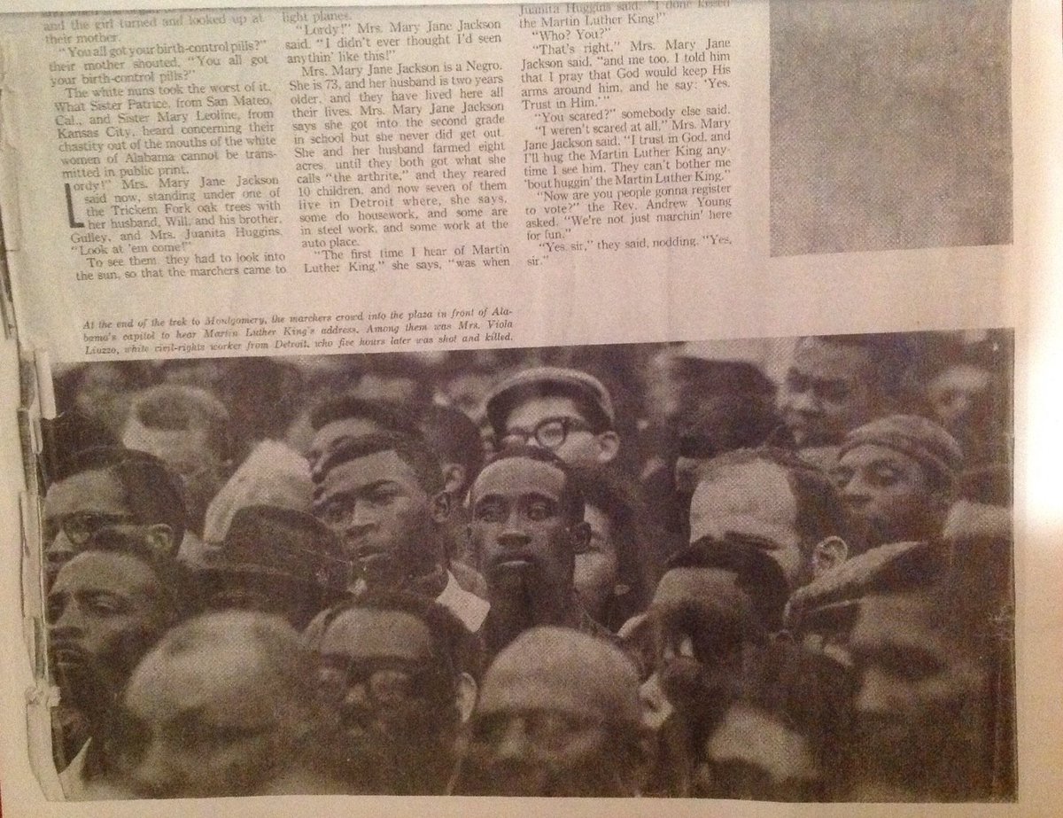My Father, (immediately to the left of the Man staring directly at the camera), born and raised in Selma, Alabama, participated in the Selma March in 1965, with his friends. Emotions flood me as I realize my Daddy was there. He marched. Local newspapers photographed him.