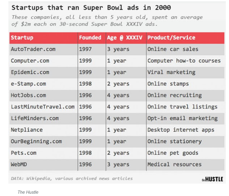 Eleven startups spent millions for 30-second spots in Super Bowl XXXIV. The very next year, 8 of these 11 companies had either gone bankrupt or been sold in fire sales. What will happen to all those that spent millions during