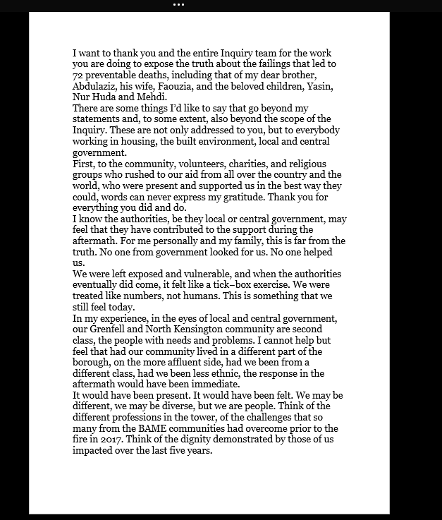 Hanan Wahabi escaped the Grenfell Tower fire but saw her brother and his family - who lived on a higher floor - die. Yesterday she gave evidence to the inquiry about the aftermath of the blaze. Here are her closing remarks (1/3)pic.twitter.com/AfaD5eS47X
