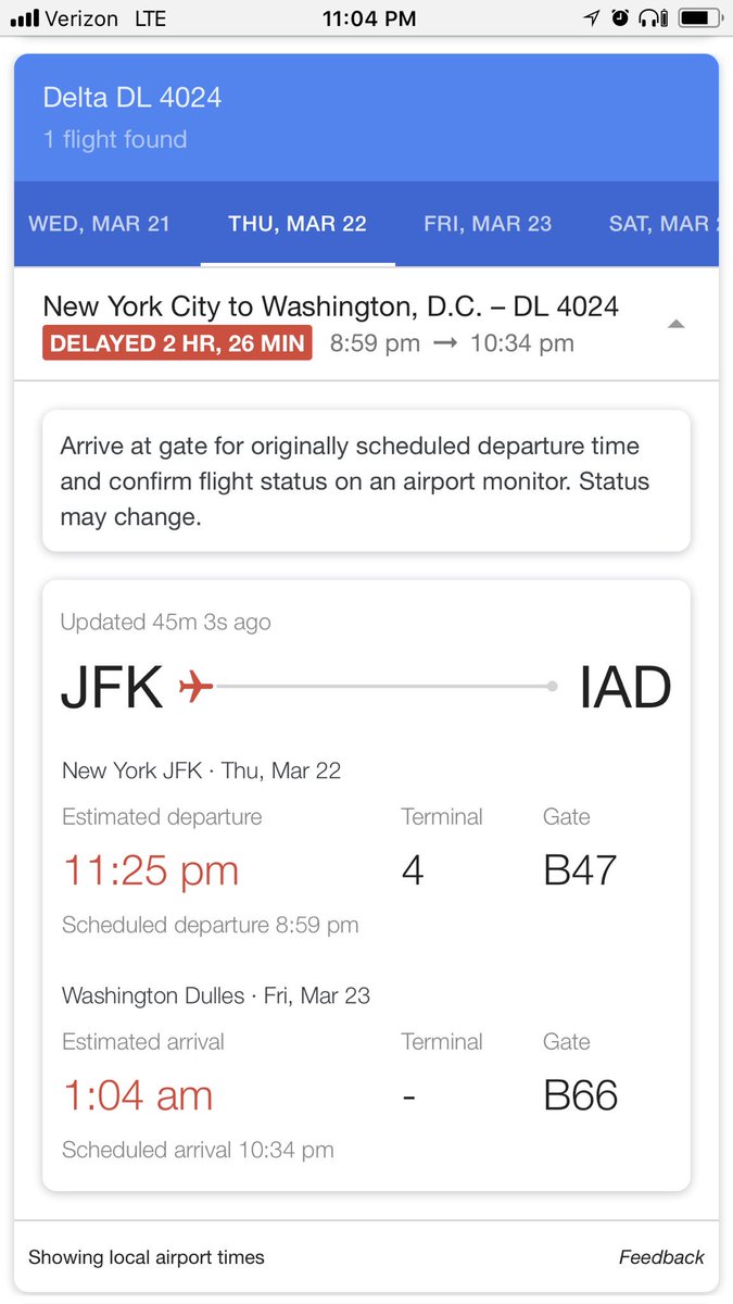 @Delta my flight from NYC to Dulles was delayers over 2 hours b/c there was no pilot. I had to change flight to arrive at BWI and spend a ton of $$$ on@lyft to make appointment on time. Anything you can do?pic.twitter.com/thwiIY2h1u