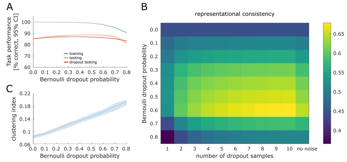 Dropout can help, but considerable differences remain. This calls into question the practice of using single network instances to derive neuroscientific insight. Going forward, multiple DNNs may need to be analysed (similar to experimental participants). /finpic.twitter.com/KJWbuPSGb9