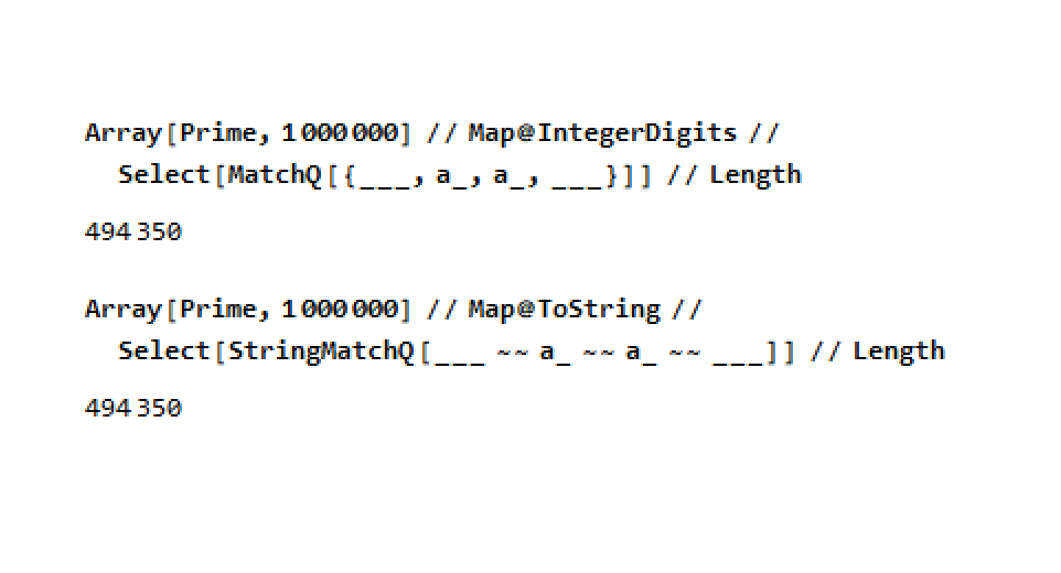 I've always loved how Wolfram created a layer over regex to unify their syntax with the pattern syntax used for arbitrary symbolic expressions everywhere in the language. Here I count the first million primes with doubled digits by pattern matching on lists of digits or strings.pic.twitter.com/gNQP5csblv