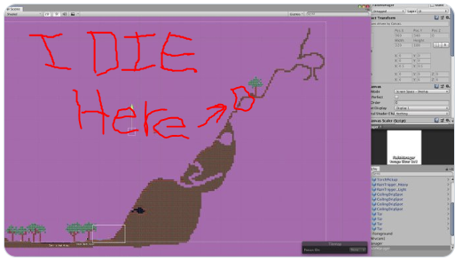 Which part Tim? I admit the end run past the caves is perhaps a little unfair. Really if you just plow through you are generally ok. Also stand in tar until your torch is full (10). I left meters off screen and opted for visuals on torch but probably too obscure.