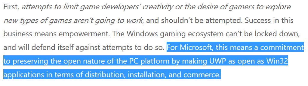 Open questions: Will devs be UWP coerced through "UWP APIs to extend your game with Windows 10-specific functionality"?