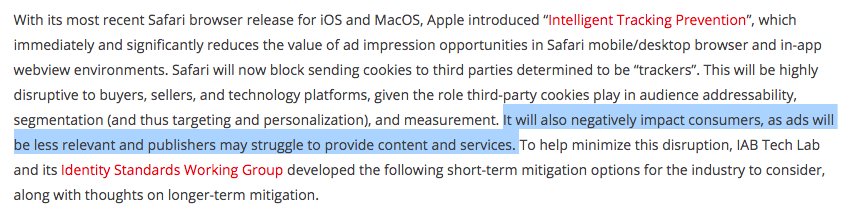 If you ever needed evidence @IABTechLab was a front for Google/Facebook/AdTech, this line makes it clear as day. https://iabtechlab.com/blog/understanding-reacting-to-apple-safari-browser-tracking-changes/ …pic.twitter.com/E9MR4cpmM3