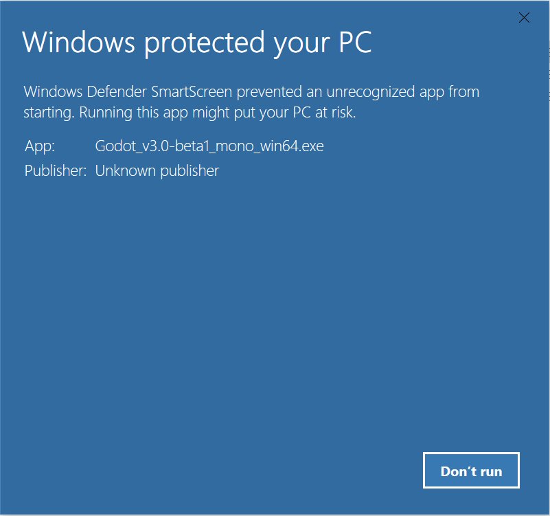 Erm, I just wanted to check my @godotengine test project on @Windows 10. Where is the "run anyway" option? Has Microsoft's "Creator's Update" made distribution for small indie devs impossible by default now?pic.twitter.com/AIea65mTGn