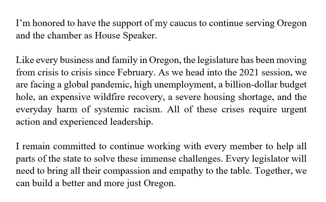 I’m honored to have the support of my caucus to continue serving Oregon and the chamber as House Speaker.