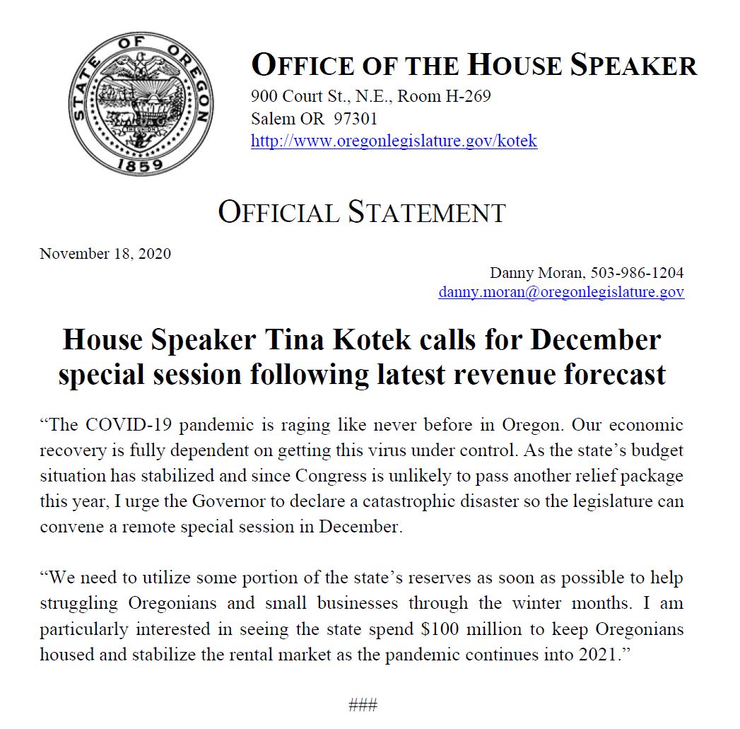 As the state’s budget situation has stabilized and since Congress is unlikely to pass another relief package this year, I urge the Governor to declare a catastrophic disaster so the legislature can convene a remote special session in December.