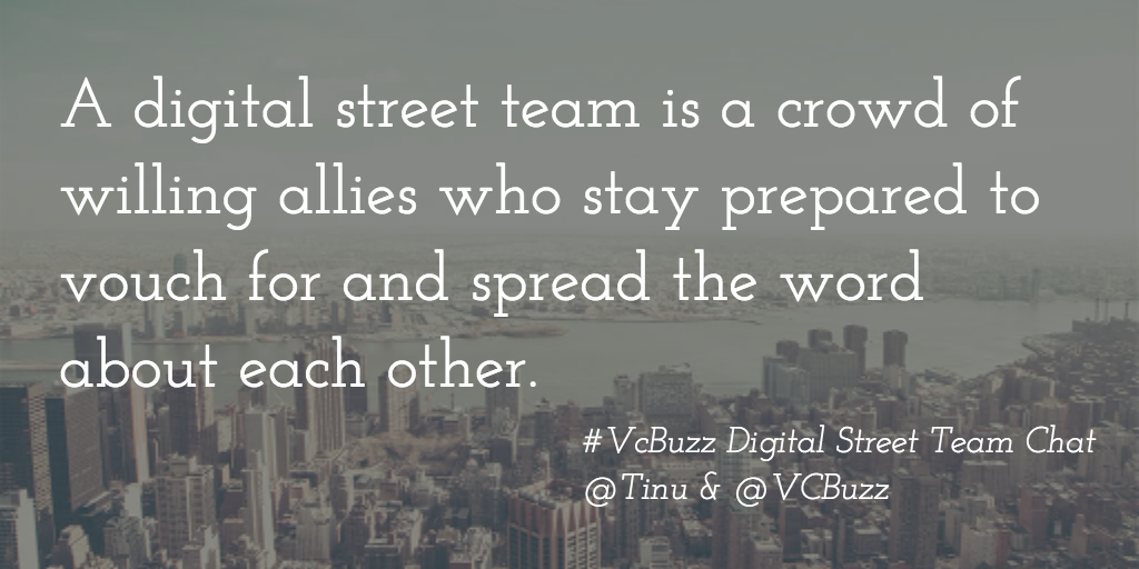 A2 That's all a digital street team is. You can start w/ VCB, Triberr to find alliances, then go from there. #vcbuzzpic.twitter.com/Az4XUCQltb