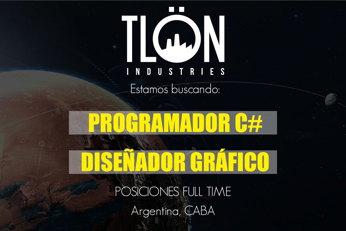 [SPANISH] [Argentina - CABA] En Tlön Industries nuevamente abrimos la convocatoria para los siguientes puestos (IN SITU Y FULL TIME AMBOS): -Programador C# -Diseñador gráfico Con experiencia en videojuegos (excluyente)pic.twitter.com/l3t4CeBAdS