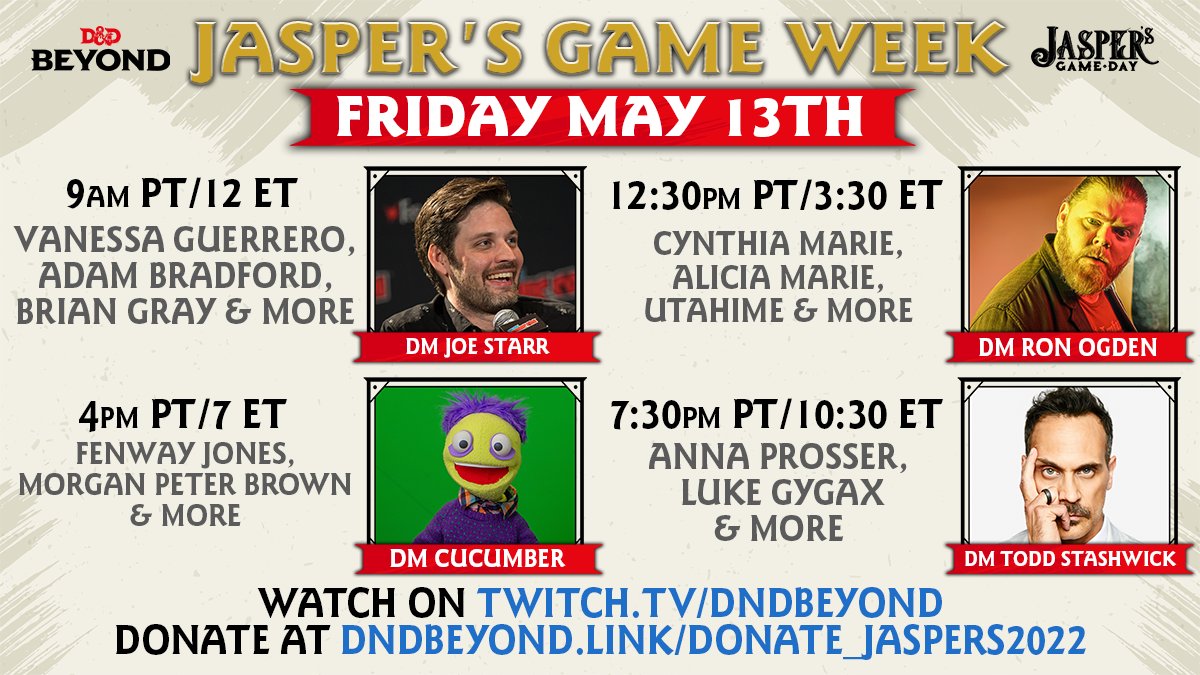 @ToddStashwick Running a game with@AnnaProsser,@lukegygax, and@Robotcoat. Donate at http://dndbeyond.link/donate_jaspers2022 …pic.twitter.com/KFOcfgS7KO