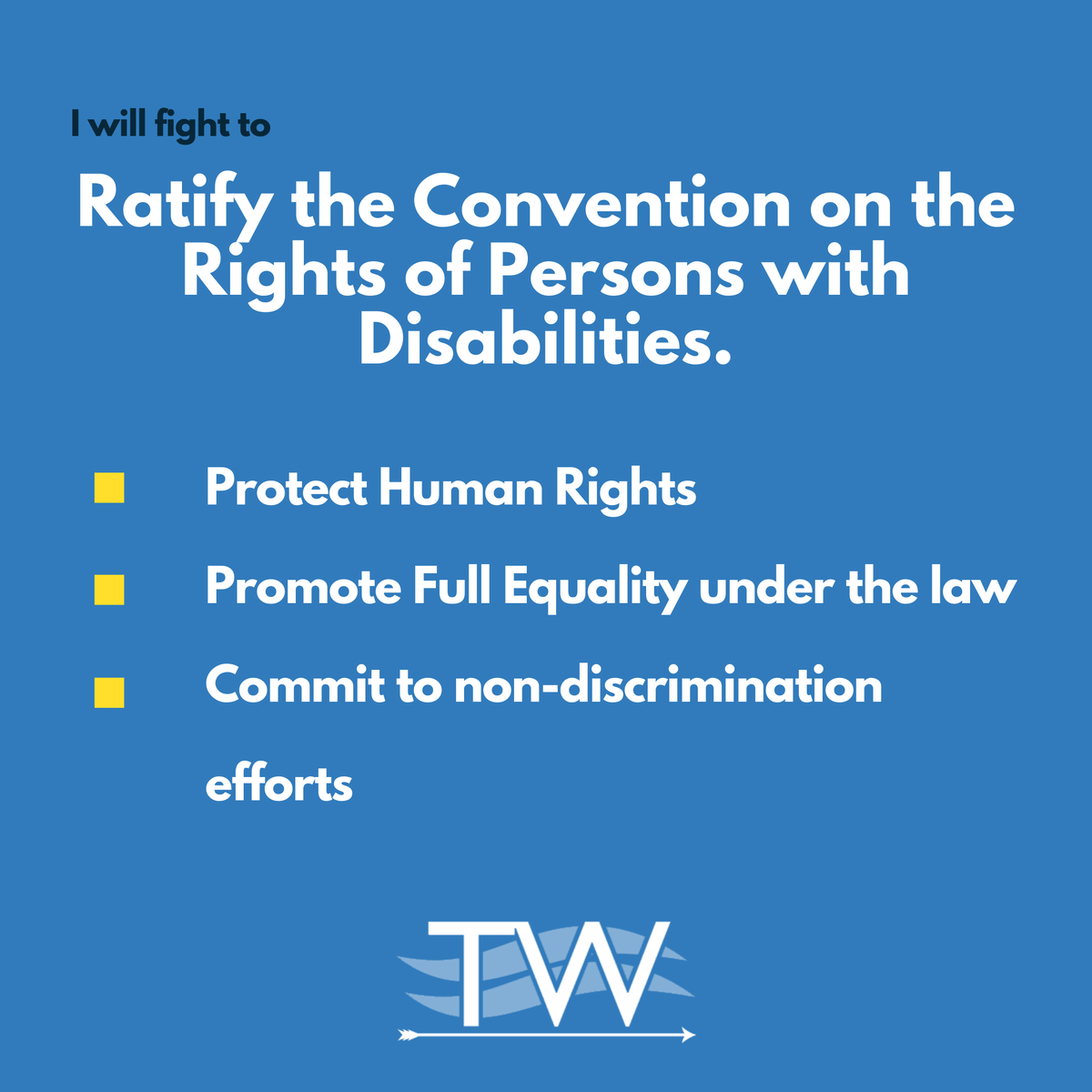 As your Congressman, I will fight to ratify the Convention on the Rights of Persons with Disabilities. We need to protect human rights, promote full equality under the law, and commit to non-discrimination efforts.pic.twitter.com/yuj6HEFEA0