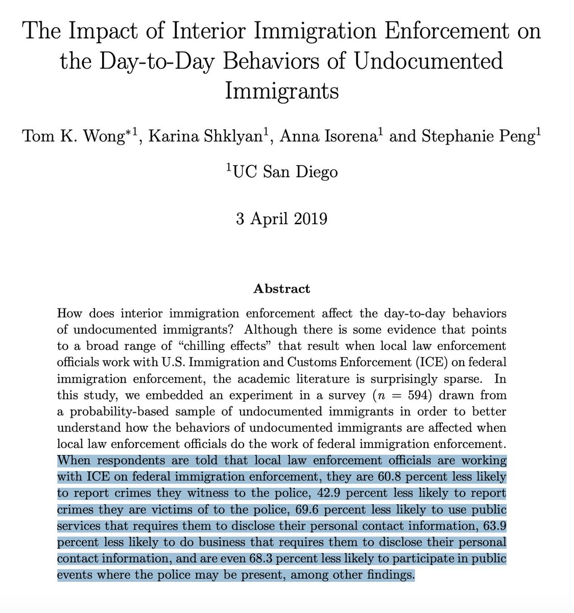 In newer research, I've found that local law enforcement cooperation with federal immigration enforcement officials has "chilling effects" on a broad range of the day-to-day behaviors of undocumented immigrants, including crime reporting 6/pic.twitter.com/2qKAMTAmVq