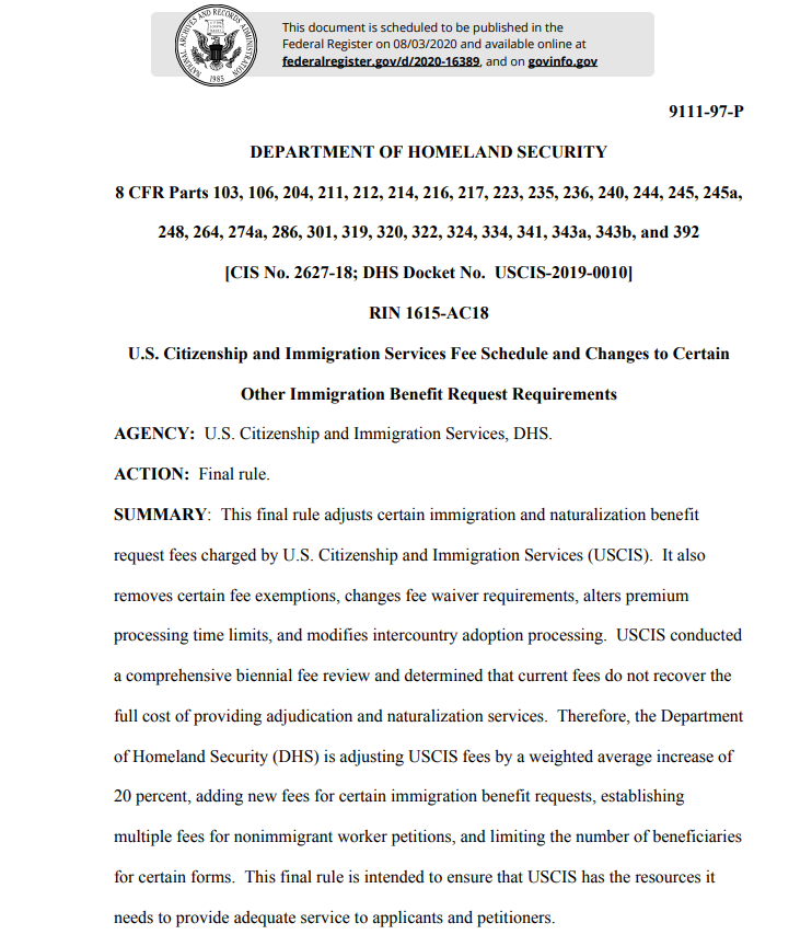 According to a statement from DHS that showed up in my inbox this morning, asylum seekers will have to pay a fee to apply for protection beginning in October. Full rule here: https://s3.amazonaws.com/public-inspection.federalregister.gov/2020-16389.pdf … pic.twitter.com/LuPwimDkJa