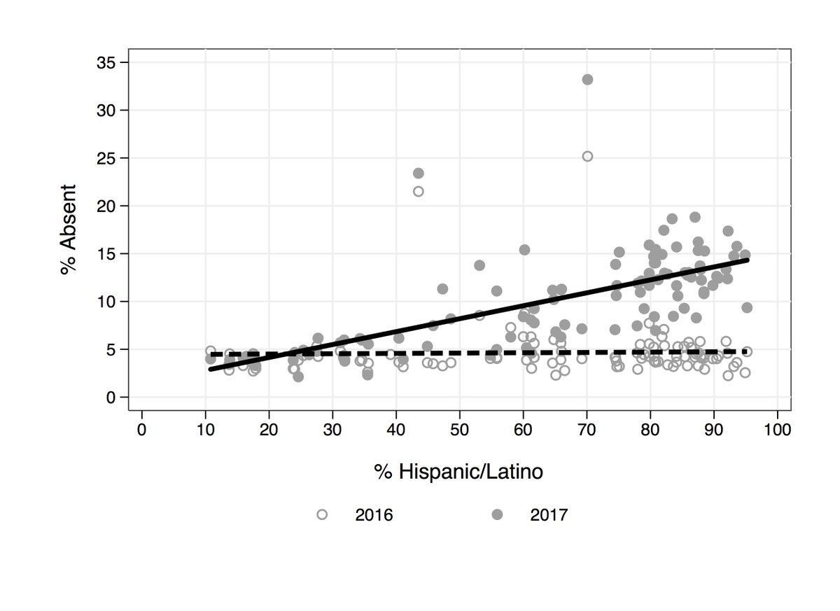 Solid circles represent absences by school for week in question in 2017. Hollow circles represent absences by school for 2016