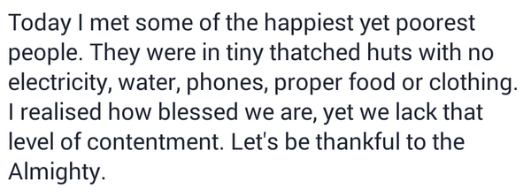 Today I learnt a great lesson from some poeple who live in tiny thatched huts with no electricity, water, phones ...pic.twitter.com/c03rXDTSFm