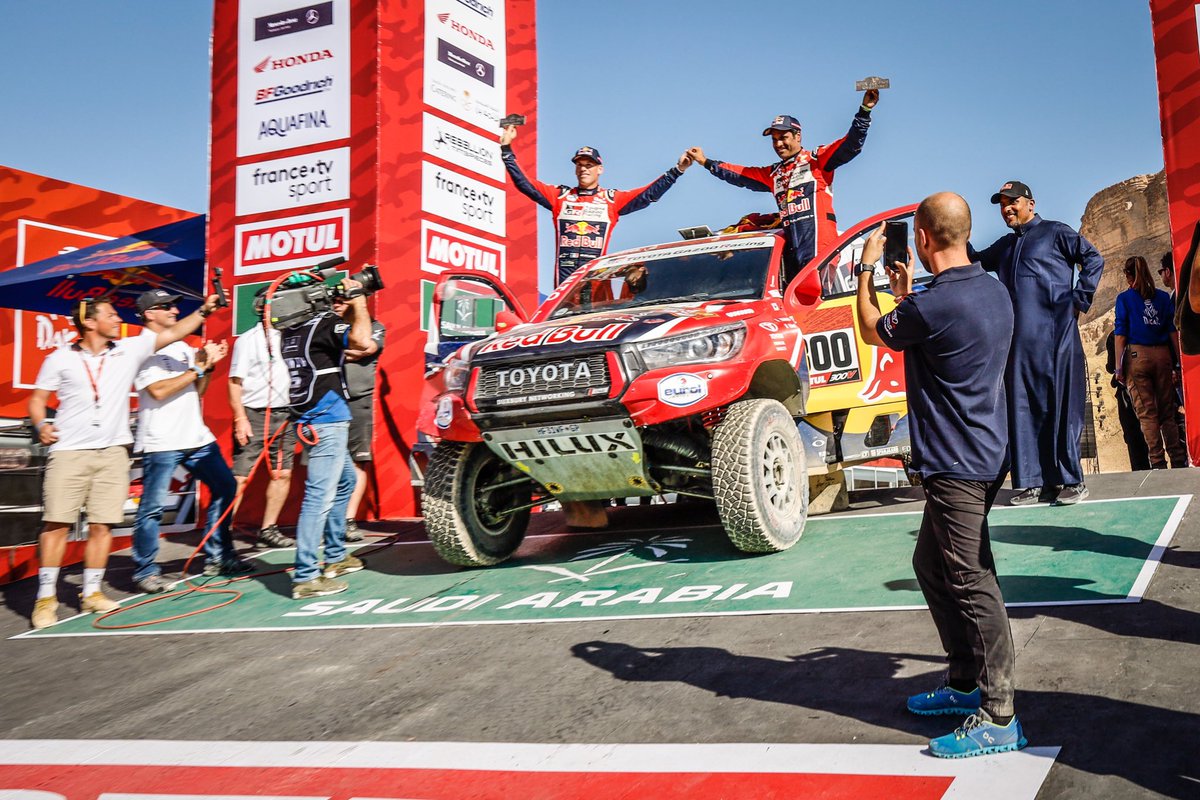 @CSainz_oficial pour sa victoire au#Dakar2020. Félicitations également au Team#ToyotaGazooRacing et ses pilotes :@AlAttiyahN finit à la 2è place après un incroyable parcours !@TheRealGiniel P5,@b_tenbrinke P7,@alo_oficial P13.pic.twitter.com/PvEHpbfLt7