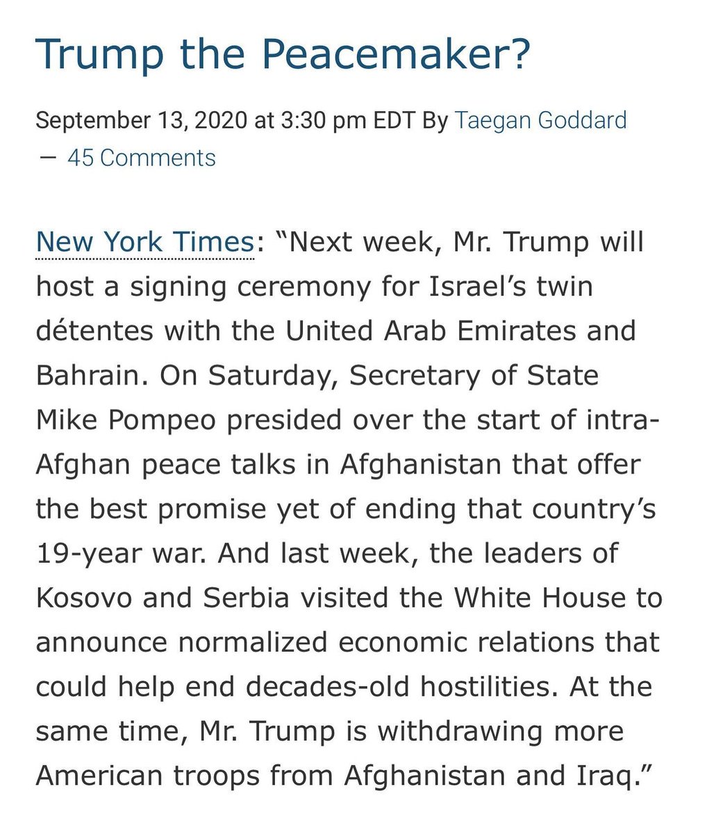 Peace in the Middle-East: (Israel, UAE, Bahrain, Serbia, Kosovo...) actively working to finally end the 19y.o. Afghan war, bringing troops home from Iraq, Syria, NO new wars.. #ActionsNotWords #NobelPeacePrize #ChooseLovvNotWarpic.twitter.com/KArUD4UdOF