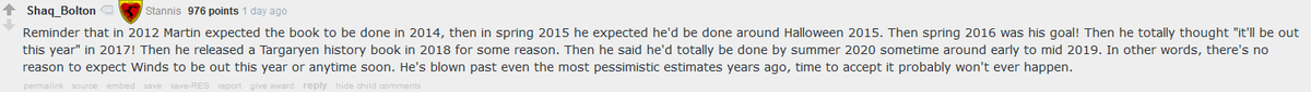 so yeah, even if George comes out with 1000 pages of random people walking around Westeros it's still better than whatever we were fed