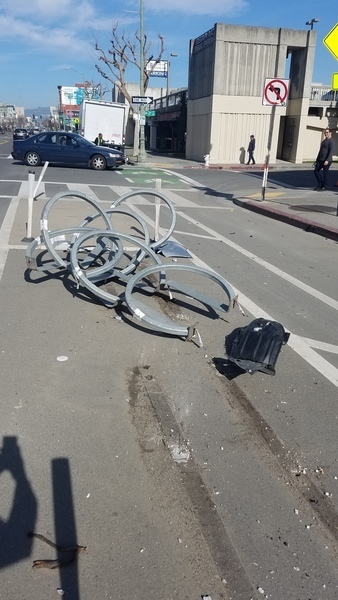 This rogue plunger + pool noodle protected bikeway on Lake Merritt Blvd in Oakland was just unveiled. Hats off to whoever was responsible!