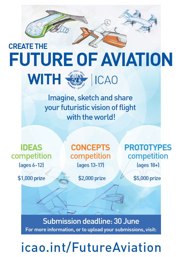 about the future of flight? Submit it to @icao’s innovation competitions. Three competitions are available (6-12yrs; 13-17yrs or 18yrs and over): http://ow.ly/26zR30ol4M4#ICAO75#UN#AvGeekpic.twitter.com/IEeujUlzPN