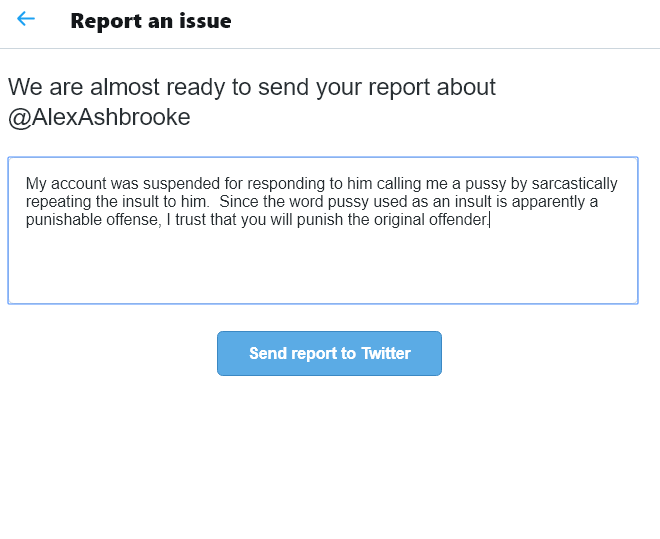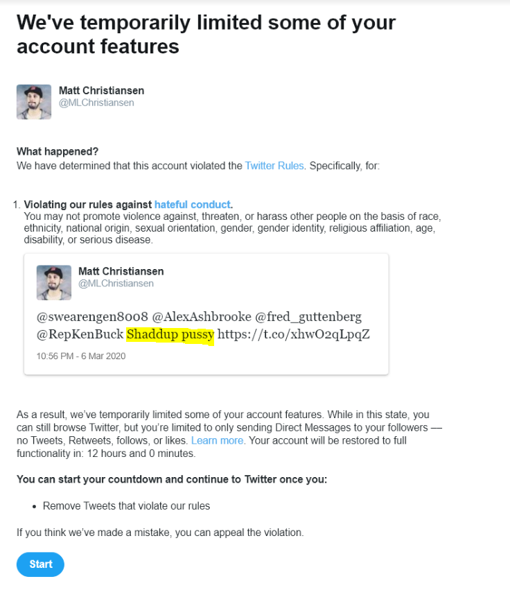 Check this out: earlier this week, Twitter suspends me for 12 hours, because some gun grabber called me a pussy and later in the thread, I sarcastically mocked him, calling him a pussy back. Twitter suspends me, but finds no violation on his part.pic.twitter.com/ywYNC8YpjF