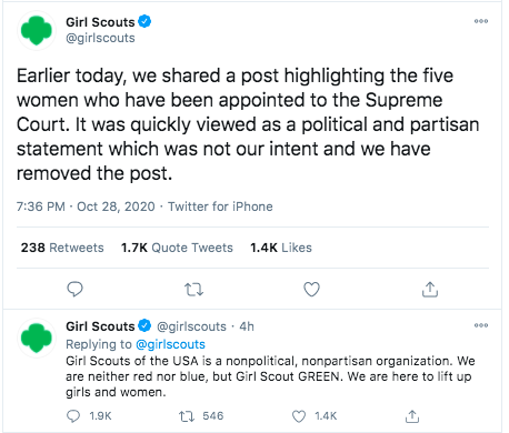 I actually don't care what @Girlscouts tweets. What does bother me is that the real victim are the girls who could have learned a valuable lesson in principle & courage. Now they'll just see what it means to be submissive to a mob.https://twitter.com/JerryDunleavy/status/1321659787432628224 …