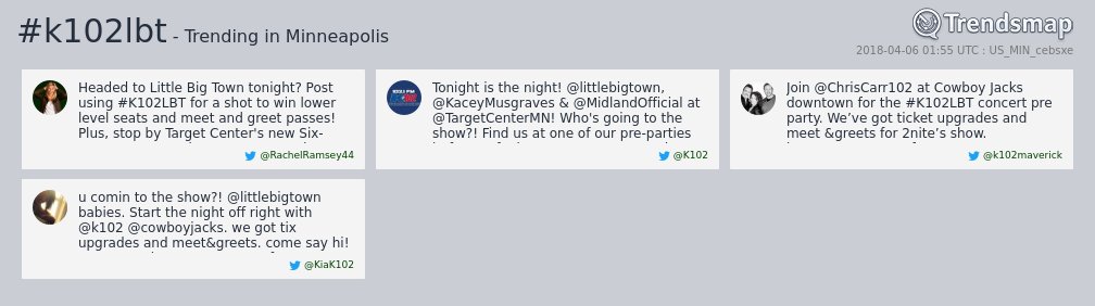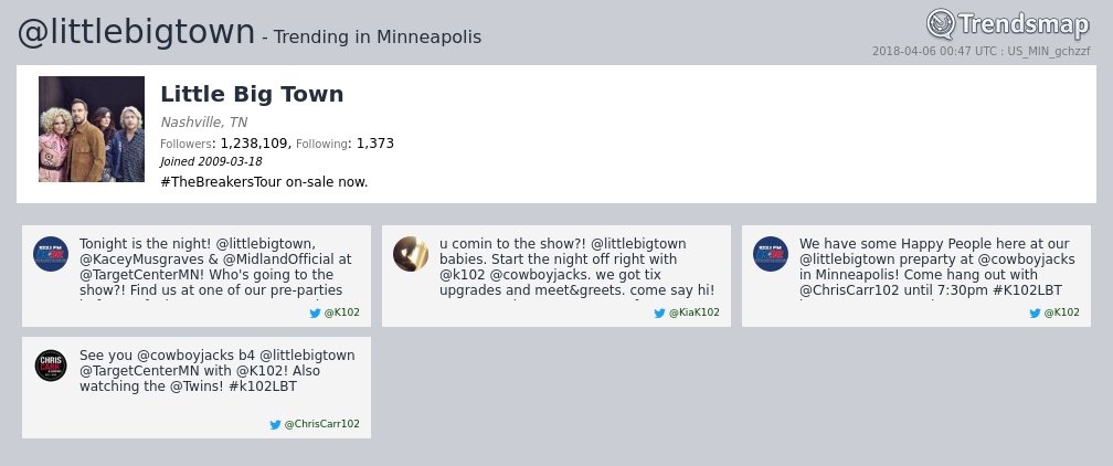 @littlebigtown is now trending in#Minneapolis https://www.trendsmap.com/r/US_MIN_gchzzf pic.twitter.com/DkPWcjKvuX