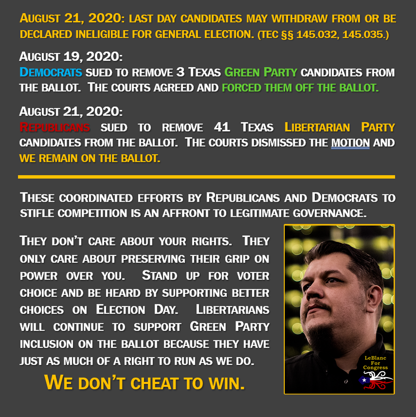 #Republican and#Democrat collusion is targeting#GreenParty and#Libertarian Party candidates in the great state of#Texas. If you want to win elections, nominate good candidates. This Libertarian will never support#VoterSuppression.#FreeTheBallot#TexasVoters#GetOutTheVotepic.twitter.com/WcaEop7ium