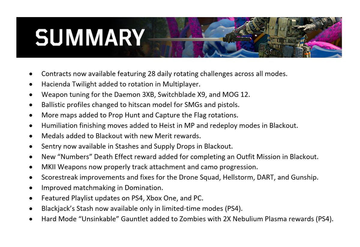 This week’s #BlackOps4 game update delivers the launch of Contracts, Blackout updates, Hard Mode Gauntlets, Hacienda Twilight, weapon tuning, and more. Get all the details + patch notes here: https://www.reddit.com/r/Blackops4/comments/c5hkp3/june_25th_update_contracts_hacienda_twilight/ …pic.twitter.com/SCWNAAcEI6