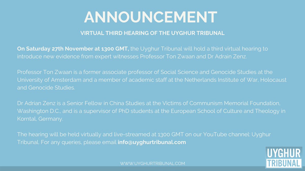 #Uyghur Tribunal will hold a virtual third hearing on Saturday 27th November at 1300 GMT to introduce new evidence. The hearing will be live-streamed via our YouTube channel: Uyghur Tribunal.pic.twitter.com/yOenoCntKB
