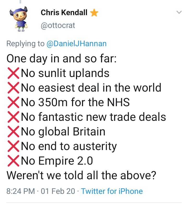 Many of us "eurosceptic left" actually voted remain to oppose a Tory hard Brexit, meanwhile FBPE centrists refused any compromise through the whole process. This hot take is garbage.https://twitter.com/rhysmorgan/status/1223168275242242048 …