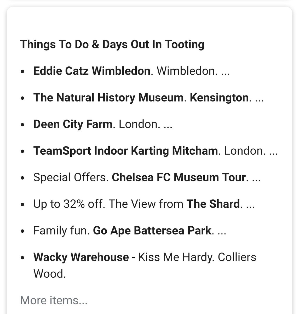 Google's suggestions for things to do in Tooting all involve leaving Tootingpic.twitter.com/FZLIvzVm0F