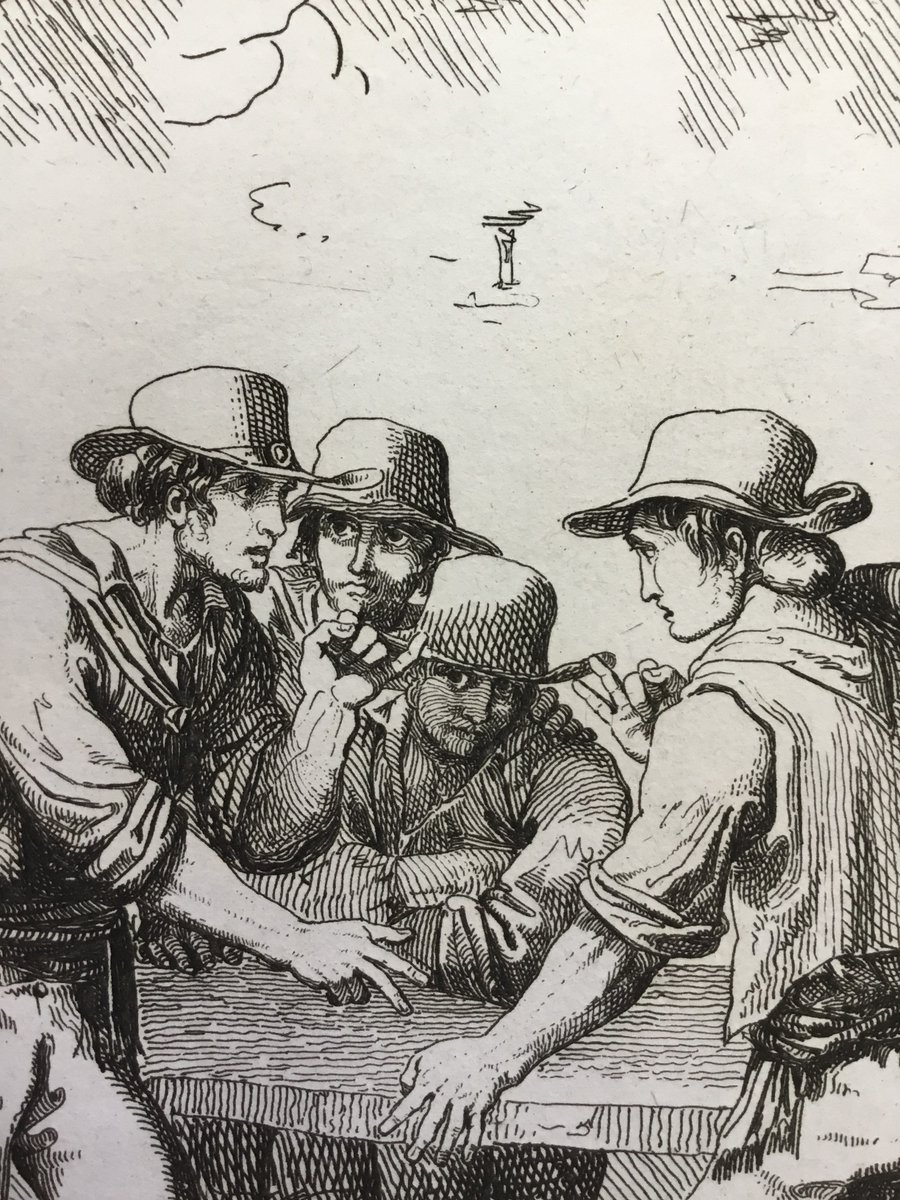 Morra players, from a woodcut by Bartolomeo Pinelli (1781-1835), in "Raccolta di cinquanta costumi pittoreschi incisi all'acqua forte" (catalogue record: http://ow.ly/R23E50y6MGs ). The second man from the left is clearly attempting to mind-read.