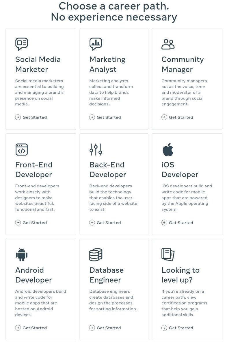 So Meta now has Career Certificates like Google! And like they are FREE to take the course and $50 for the certificate! Scholarships are launching soon too! There's a nice list of programs and once you complete them you get access to 200+ employers hiring people with the cert!pic.twitter.com/jU72tvfrMz